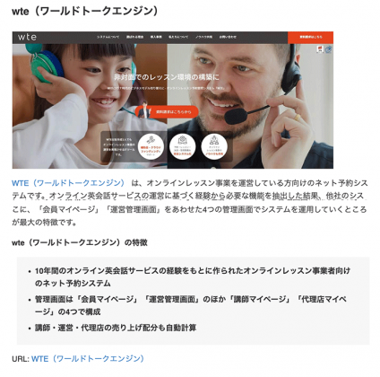 その中でも、WTEはオンラインレッスン事業を運営する方向けのネット予約システムとして、弊社のオンライン英会話サービスの運営に基づいた機能開発であったり、管理画面の特徴についてもご紹介いただいております。